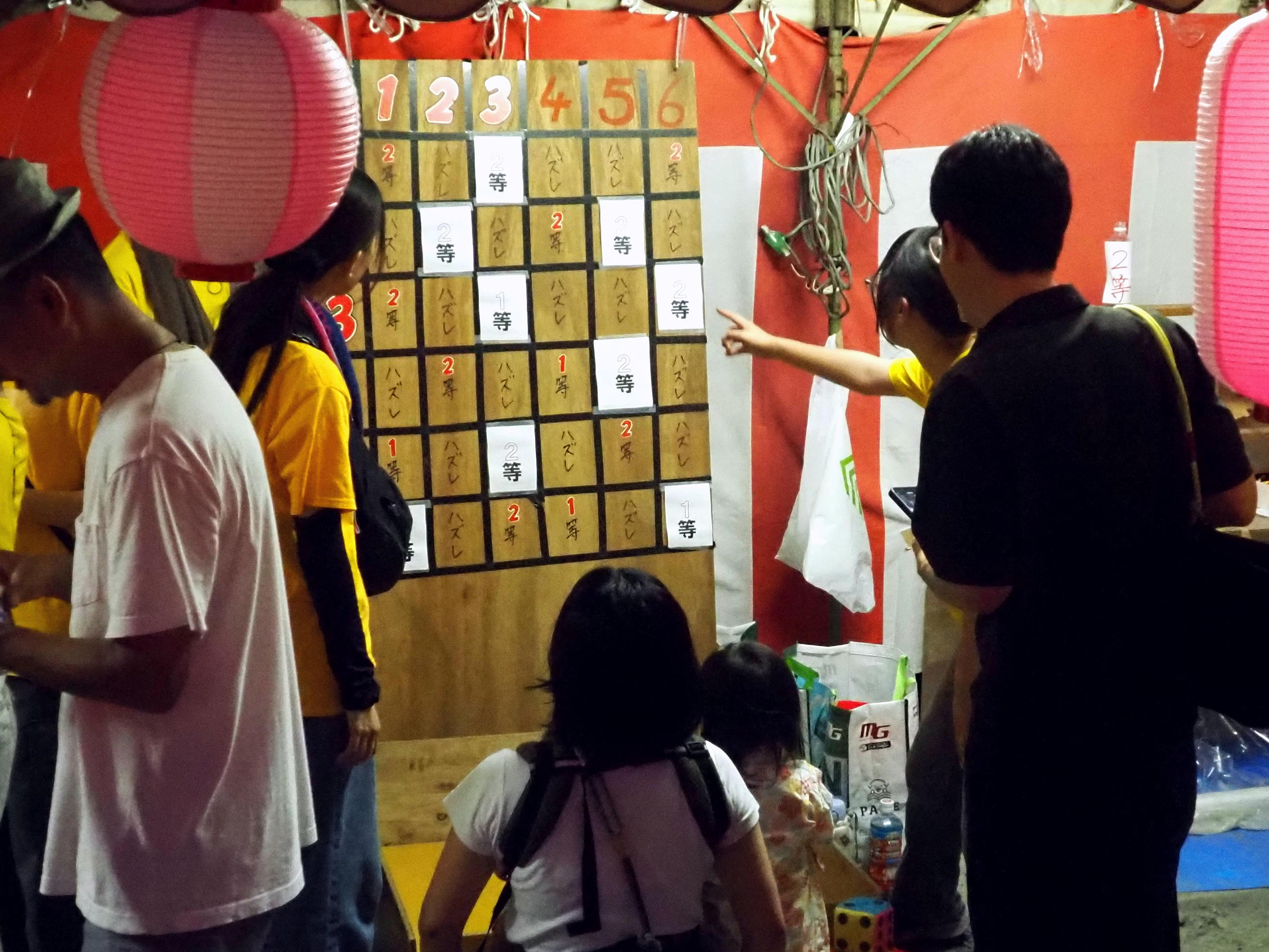令和元年 大観音盆踊り大会のご報告 文化部副部長(当時) 熊澤 一郎 総評 昨年の大観音盆踊り大会は令和元年八月二十三日(金)、二十四日(土)の二日間、光源寺で実施されました。 時折小雨降る蒸し暑い最中、多くの町内会、近隣町会の皆様にご参加頂き、無事故で無事終了することが出来ました。厚く御礼申し上げます。 中央に櫓(太鼓)を据え、太鼓を囲んで周囲に盆踊り用の舞台を設置、盆踊りは太鼓を中心に舞台とその周りを反時計回りに進行しました。曲目は全十曲を順番に流しました。 境内外周はゲームおよび屋台各種を配置し(詳細は後述)、町会の皆様には無料券を配布しました。 アンケート箱は入口に前回同様設置しました。多くの皆様から意見を頂きました(詳細は後述)。 二日間、大変多くの方にご参加頂きました。重ねて御礼申し上げます。 また今回ご協力頂いた光源寺、白山上向丘商店街、大観音通り商栄会、上千駄木町会、千駄木西林町会、肴町町会、駒本小学校、駒込学園和太鼓部、東洋大学学生ボランティアセンター、東洋大学剣道部、郁文館夢学園、居酒屋まぬけの皆様には感謝致します。御礼申し上げます。 次回の盆踊り大会も多くの皆様に参加いただけるよう町内会一体となり頑張りたいと思います。 ゲームについて総評 ゲーム遊びその他は、以下の八種を設置しました。 ① 射的 ② サイコロ投げ ③ 輪投げ(子供用・大人用) ④ ヨーヨー ⑤ 紐引き ⑥ 釣りゲーム ⑦ 飴細工 ⑧ 似顔絵 二日間とも全体に渡り盛況で、特に射的の行列が目立ちました。 各ゲーム共通でゲーム終了後に一等、二等、三等、残念賞のいずれかの券が配布され、景品所で商品を渡すシステムを採用しました。盛況に伴い初日、二日目ともに景品品切れの状況になりました。所々でスタッフの対応が至らず、進行に不備が生じた事をお詫び致します。 飴細工はあめ細工吉原さんにご協力頂きました。小鳥、イルカ、犬、猫など種々のかわいい動物たちを熟練の技で見せて頂きました。 似顔絵は前回の盆踊り大会でもご協力いただいた森さんにお願いいたしました。 全体を通して子供たちの喜ぶ(興奮する)姿を目の当たりにし、準備や会場設置の苦労が吹き飛んだ次第です。多くの皆様にご来店頂き御礼申し上げます。 屋台について総評 屋台は、以下の八種を設置しました。 ① 焼きそば ② 味噌おでん ③ フランクフルト ④ 焼き鳥 ⑤ かき氷 ⑥ ラムネ,ジュース ⑦ 缶ビール,缶酎ハイ ⑧ ウーロンハイ,レモンサワー 特に焼きそば、焼き鳥が大盛況で長い行列が絶えませんでした。 また味噌おでん、フランクフルトも盛況で、絶え間なくお客様に足を運んで頂きました。 かき氷,飲料関係は蒸し暑さも手伝い、売れ行き良好で、ラムネ(初日で完売)、缶ビールはすべて売り切れました。 全体に常に人が絶えず来店頂き、大盛況でした。改めて感謝申し上げます。 アンケート結果について アンケート箱は平成二十九年度に続き、今回2回目の試みでした。 アンケート総数は十五名でした。 内訳は男性6名,女性9名、年齢構成は9歳以下1名、10代5名、20代1名,30代5名、40代3名、50代、60歳以上0名でした。 お住まいは文京区内と区外がほぼ半々で、ご来場のきっかけとして興味深いのは「偶然通りかかった」「音が聞こえたから」など、掲示板が設置されていない町外(蓬莱町以外)への情報提供が難しいことが分かりました。 楽しかったゲームは? の質問には概ねゲーム全般を評価して頂き、新たな要望としては「金魚すくい」が多く見受けられました。 屋台に関しては、焼きそば、焼き鳥、かき氷が「楽しかった、おいしかった」屋台として挙げて頂きました。 要望(やってほしい屋台)としては、チョコバナナ、りんご飴、わたあめ、イカ焼、から揚げ、チキンステーキ、カレーなどが挙がりました。 盆踊り曲目の要望は全十曲以外に、天城越え、USAなどのご意見を頂きました。 次回盆踊り大会の参考にさせて頂きます。貴重なご意見ありがとうございました。 Tags: 蓬莱町蓬莱町会盆踊り大観音学ボラ郁文館 令和元年 大観音盆踊り大会のご報告 についてもっと読むコメントを投稿するにはログインしてください