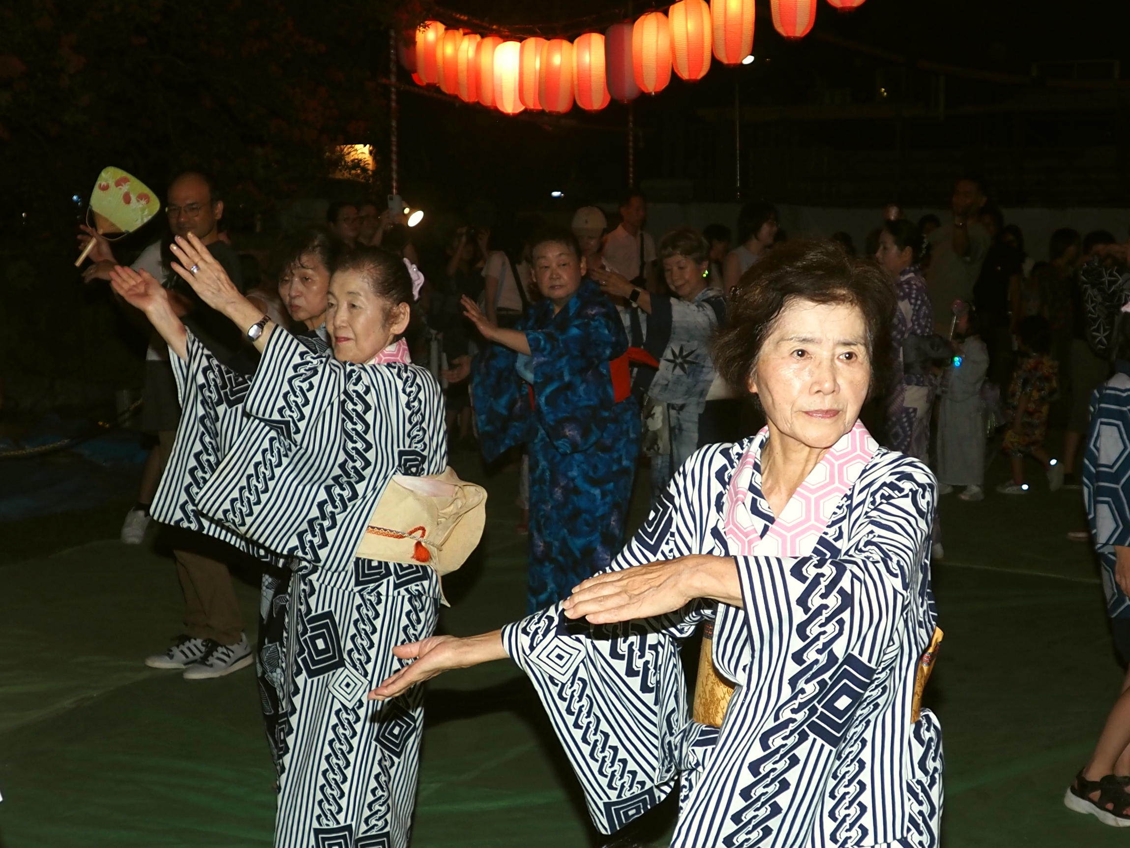 令和7(2025)年 蓬莱町会盆踊り大会のご報告 旧盆を過ぎて、また蓬莱町会盆踊りの時期がやってまいりました。 本年は8月22日(金)、23日(土)の両日、駒込大観音(光源寺)にて開催いたしました。 年を追うごとに厳しくなる酷暑の中、大勢の皆様がご来場くださいました。初日22日はオープニングに、4年ぶりとなる駒込学園高校和太鼓部の皆様による演奏がありました。暑さの中、鳥肌の立つような鬼気迫る演奏を、皆様熱心にスマートフォンに収めていました。 毎回恒例のやきそば、フランクフルト、焼き鳥、缶ビールやラムネ、射的、サイコロゲーム、釣りゲームに加え、今年初めてキッチンカーでケバブが参加しました。どのテントも長い行列で賑わい、皆様はお祭り気分を堪能されている様子でした。 もうひとつ、今回初の試みとして19時でゲームを終了し、それから盆踊りを始める時間組としました。ゲームが終了した分、テント前は広いスペースが空き、皆様はのびのびと踊りを楽しんでいました。 今回も、本郷消防署本郷消防団第六分団、踊りをご指導いただいた坂東三之昭・坂東舞桜先生、太鼓のご指導を頂いた本郷壹岐坂太鼓の皆様、学ボラはじめ東洋大学の学生の皆様、その他有志の方々に多大なご協力を頂きました。心より御礼申し上げます。 Tags: 蓬莱町会盆踊り令和7年2025年駒込学園和太鼓部東洋大学学ボラ 令和7(2025)年 蓬莱町会盆踊り大会のご報告 についてもっと読むコメントを投稿するにはログインしてください